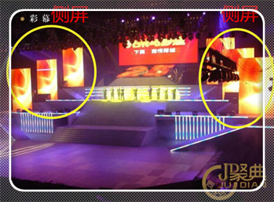 通常年会LED屏幕,由主屏和侧屏共同组成。侧屏会使整体的播放屏幕有立体环绕的效果,同时也可以达到舞台美观的作用。